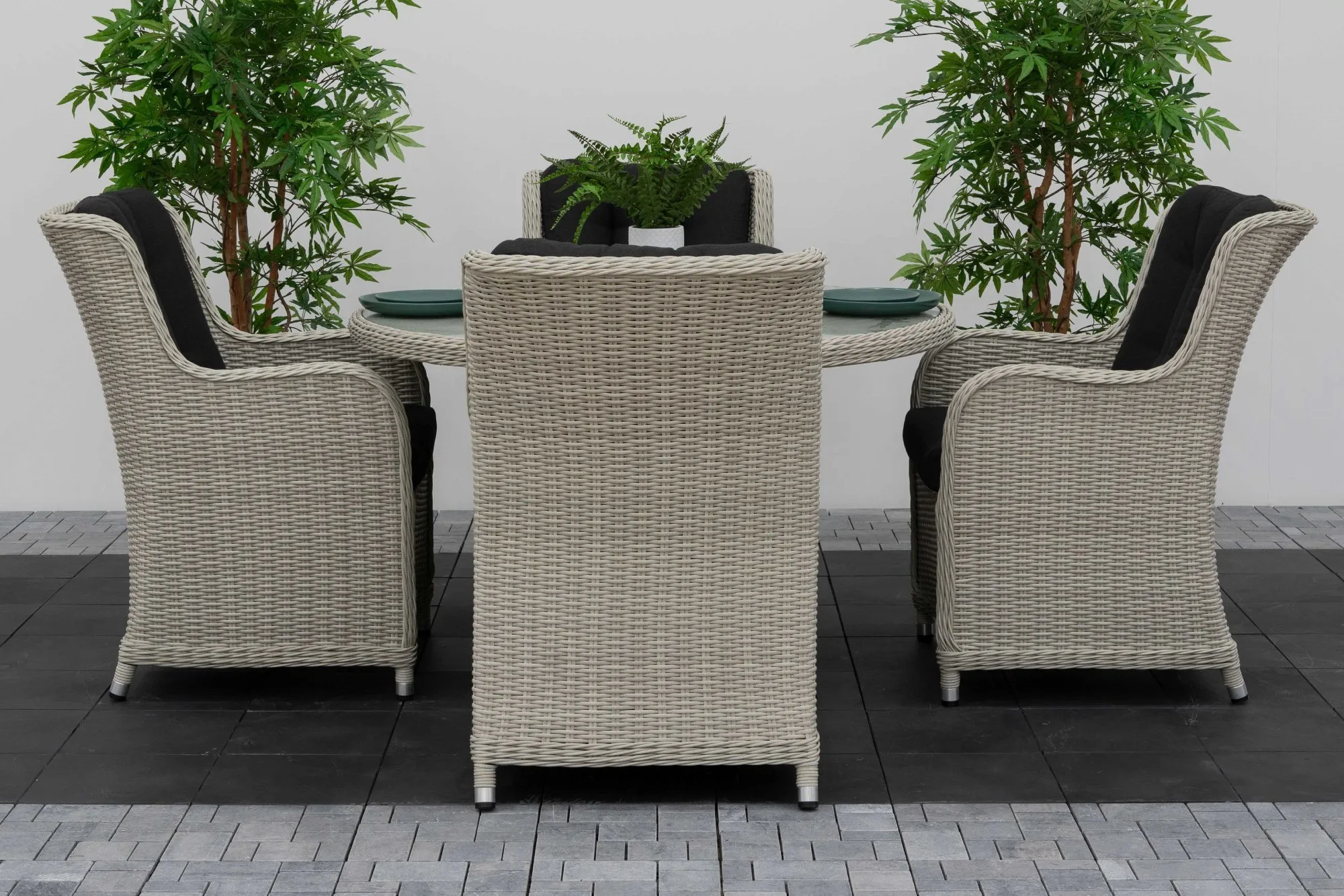 A refined yet practical option for family meals or small gatherings, this 1.2m round table and four-seater setup creates an inviting outdoor dining space. The classic woven design and muted tones blend seamlessly into garden or patio surroundings. Each chair includes generously cushioned seats for all-day comfort, while the round layout encourages easy conversation. Crafted from weather-resistant materials, this set is as durable as it is beautiful. Ideal for mid-sized patios, it brings people together in style.