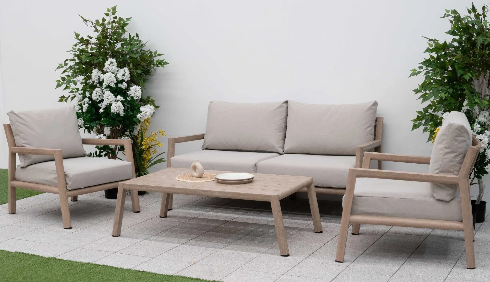 This compact yet luxurious 2-seater sofa set is ideal for smaller patios, courtyards or balconies. The sleek aluminium frame is finished in a natural wood-effect grain, offering the visual warmth of timber with all the benefits of low-maintenance materials. The generously padded sofa invites you to unwind, while the rectangular coffee table provides a practical space for drinks, snacks or décor. Stylish rope accents elevate the look, adding a soft, contemporary touch. It’s a beautifully balanced set that suits modern lifestyles and smaller garden footprints.