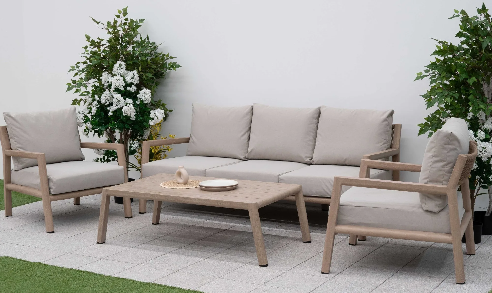 With enough room to seat the whole family or stretch out in style, this 3-seater sofa set delivers on both comfort and visual appeal. The generous proportions and deep cushions create an inviting space for relaxing, reading or hosting. Its rectangular coffee table complements the design perfectly, offering useful surface space with a sleek finish. The wood-look frame and rope detailing combine contemporary design with a natural, timeless feel. A sophisticated centrepiece for any garden or terrace.