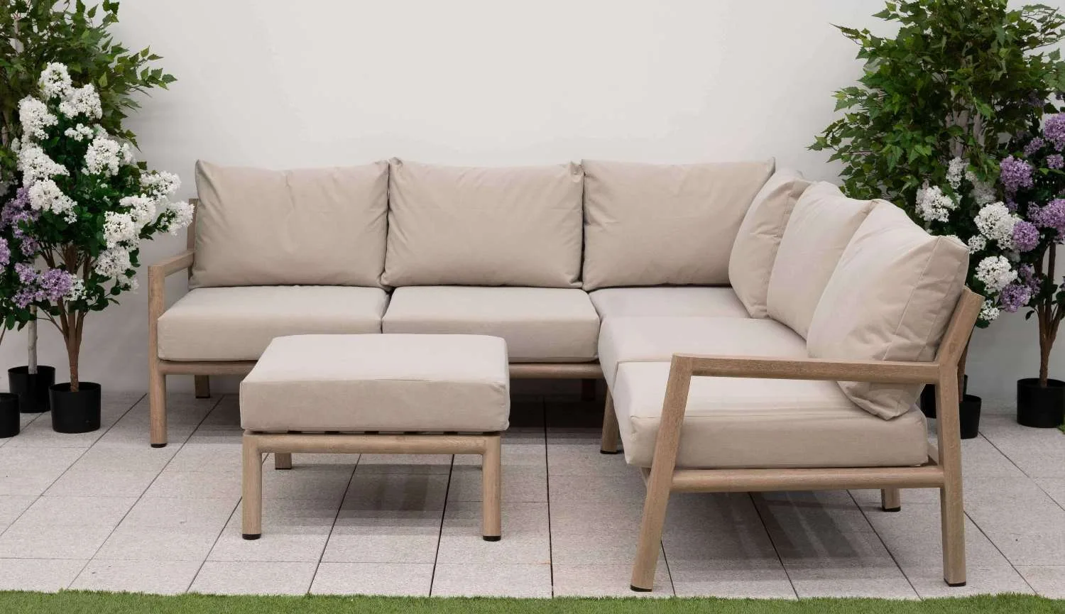 This modular-style corner sofa is perfect for sociable seating and flexible lounging. With generous dimensions and a matching footstool, it’s made for stretching out in the sun or gathering with friends. The stylish frame is durable and rust-free, featuring a natural wood-effect finish that blends beautifully with outdoor spaces. The square footstool adds versatility – use it as a seat, a table or just to put your feet up. A sleek, statement set for premium garden living.