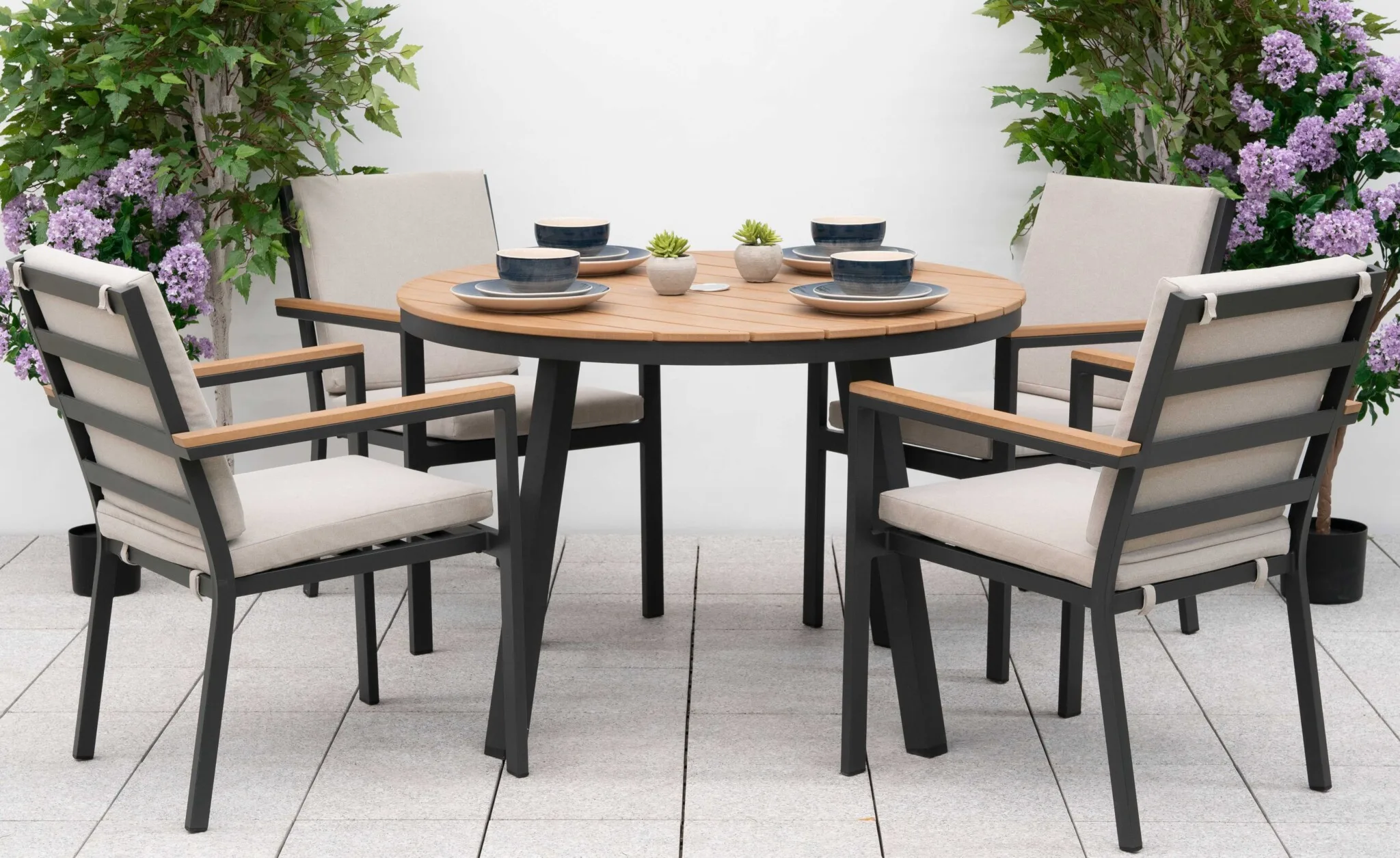 This four-seat dining set offers the perfect balance of elegance and function for everyday outdoor dining. The compact layout makes it a smart fit for patios and smaller garden spaces. Its modern aluminium and rope design provides a sophisticated look, with all the durability needed for year-round use. Ideal for family meals, casual dinners or catching up over a coffee. A stylish dining upgrade for modern homes.