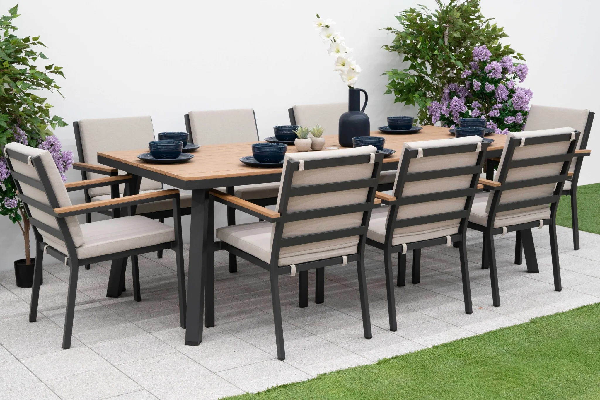 Make a statement in your garden with this spacious 8-seat dining set, centred around a striking 2.2m table. Ideal for big family meals, garden parties or celebrations, this set offers room to seat everyone in comfort. Built from low-maintenance, rust-free aluminium and featuring sleek rope detailing, it brings indoor style to your outdoor space. Soft cushions and clean lines complete the look. A must-have for those who love to host.