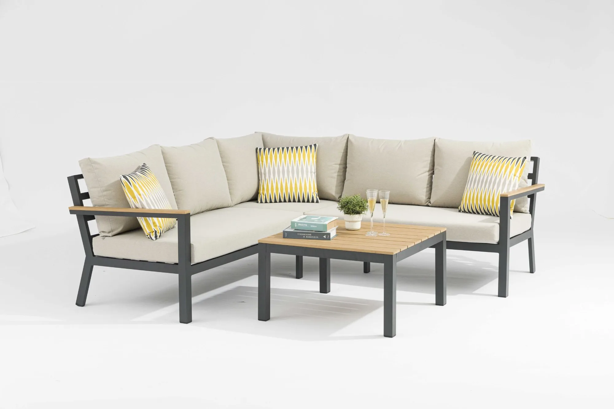 Stylish, sociable and seriously comfortable, this corner set is perfect for creating a relaxed garden retreat. The square coffee table adds a practical touch for drinks and décor, while the sofa offers ample room to stretch out or host guests. With its rope details and natural-look frame, it’s a striking focal point in any outdoor setting. Weatherproof and maintenance-free, it’s built for enjoyment in all seasons.